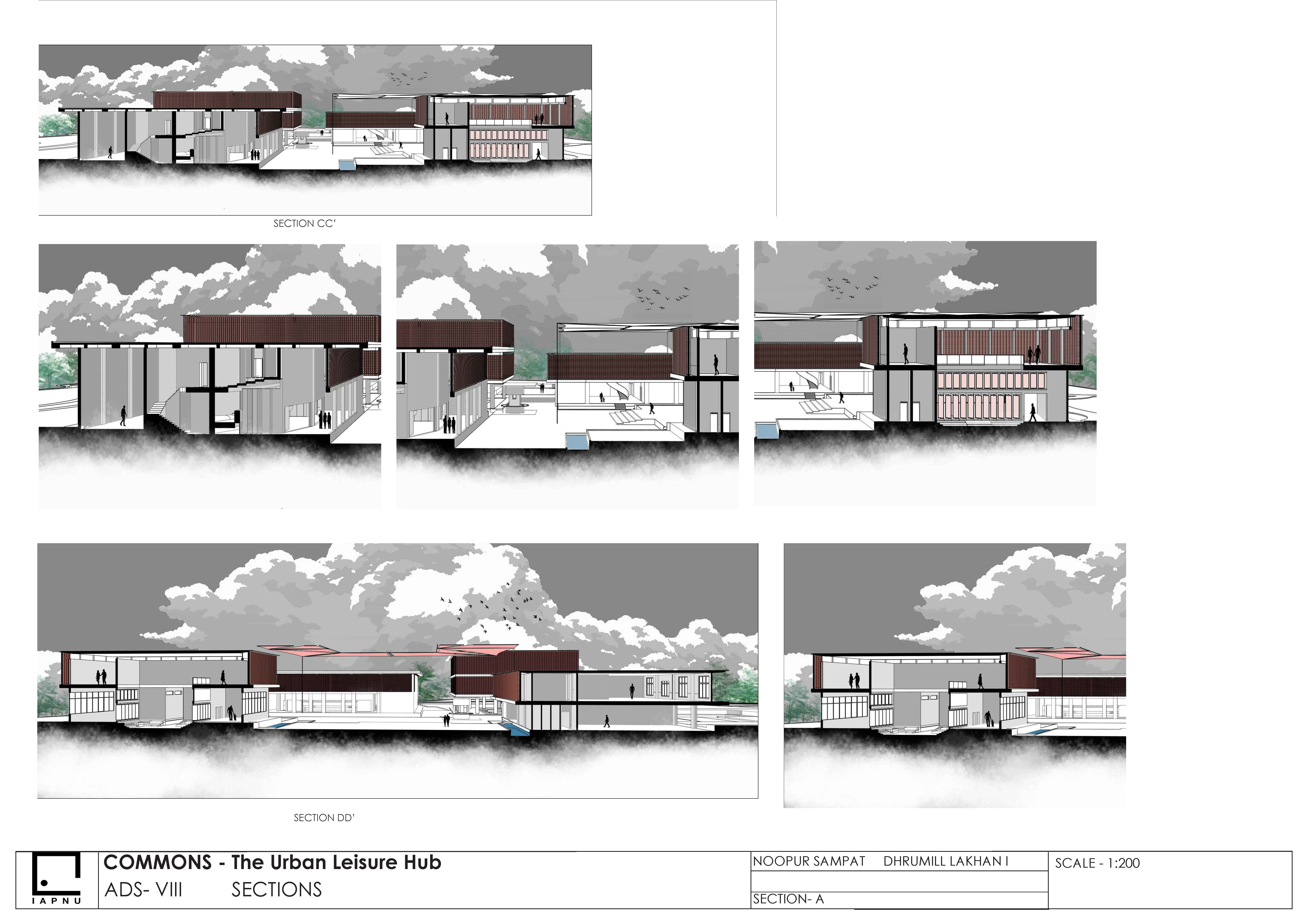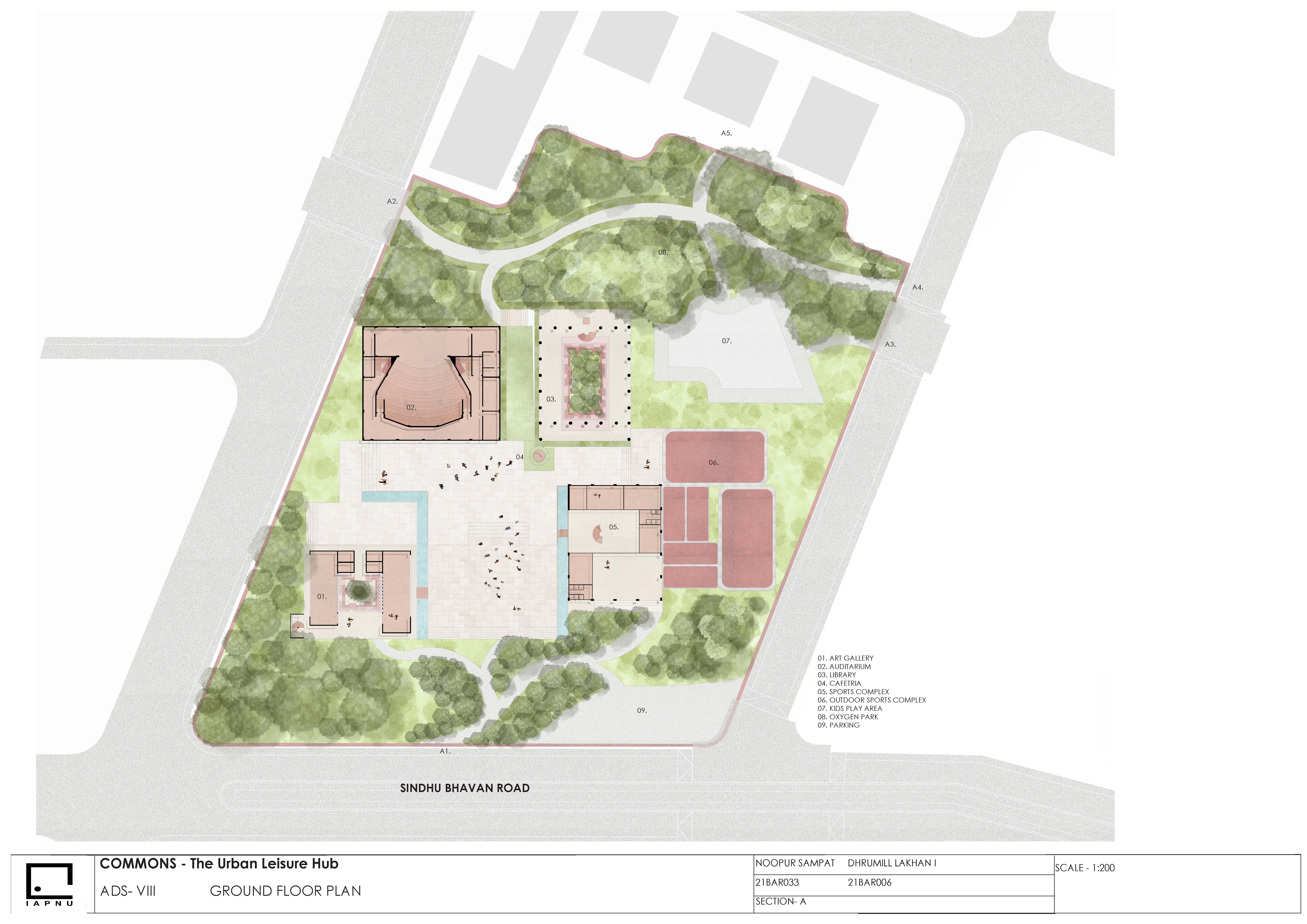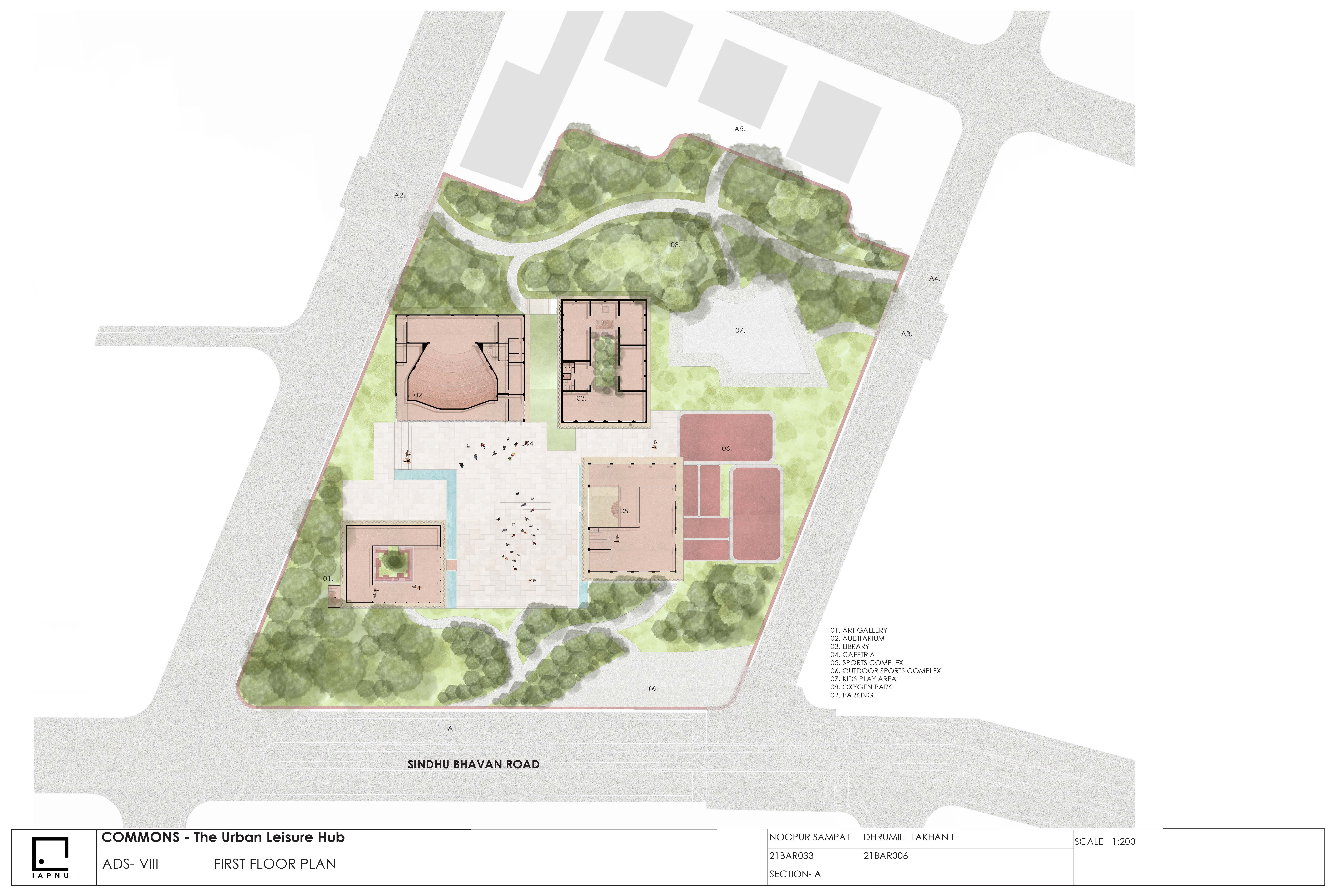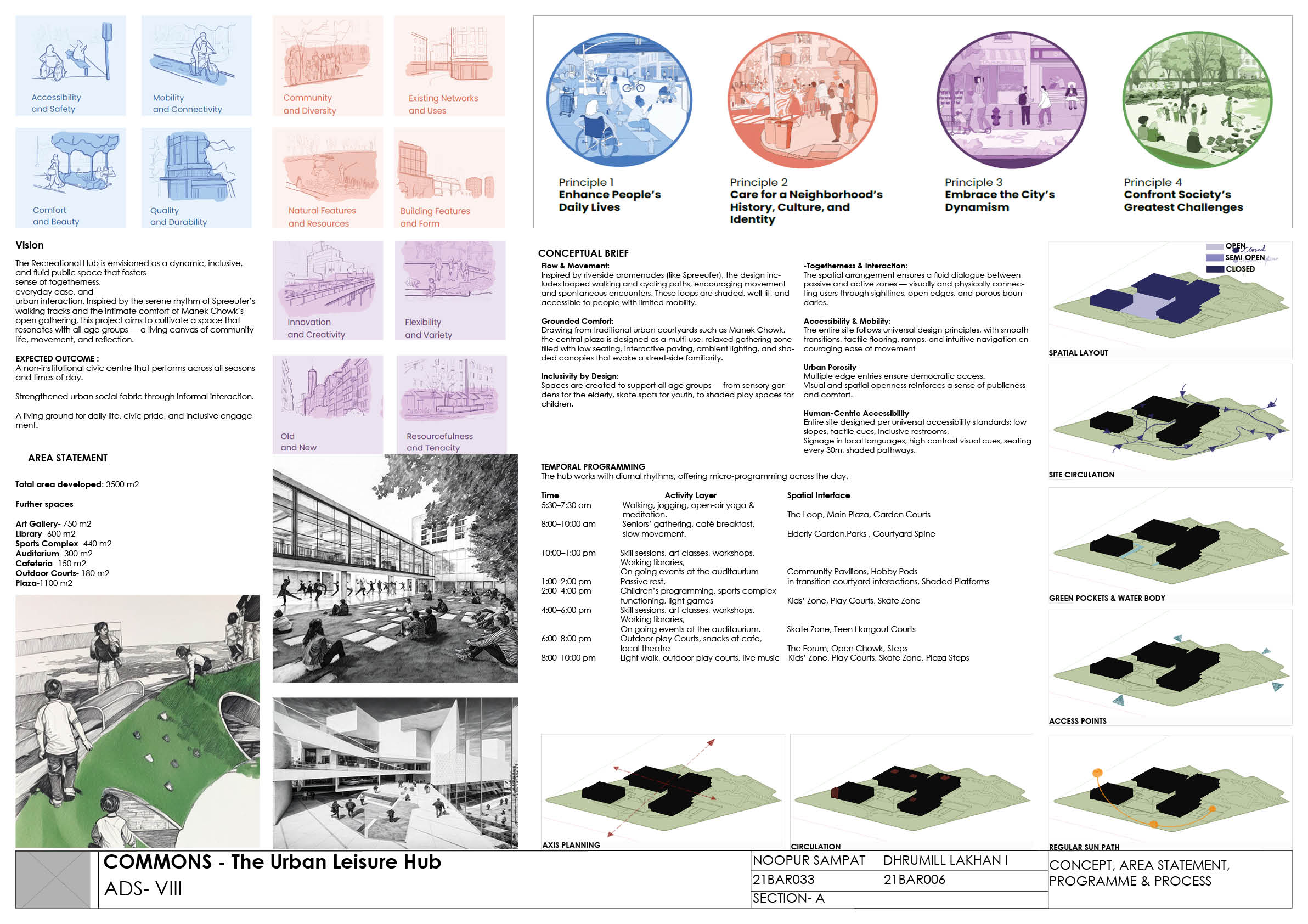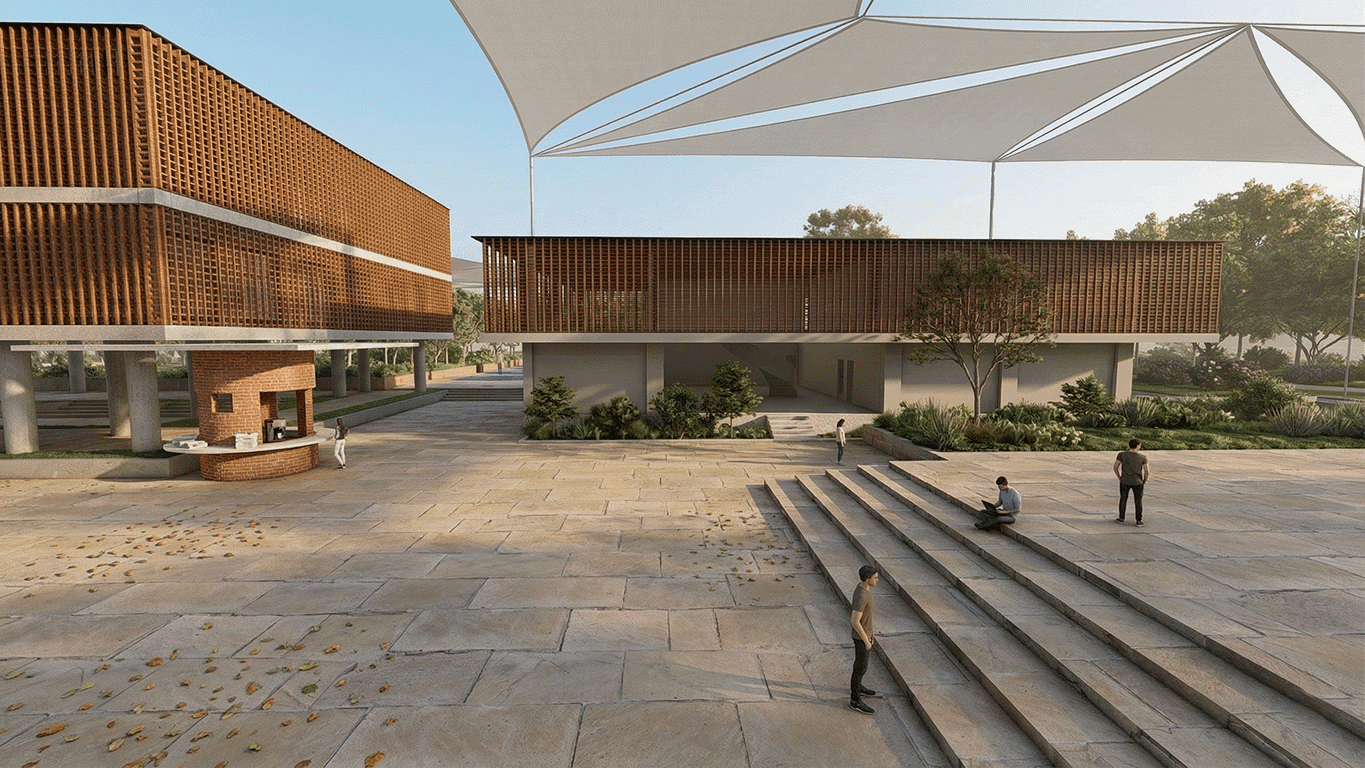 This project positions the recreational hub as an urban condenser an inclusive public realm that activates everyday life through movement, interaction, and accessibility. Drawing from the linear dynamism of Spreeufer’s promenades and the social intensity of Manek Chowk, it creates a porous, fluid environment for all age groups. The design operates as a living urban field, where circulation, pause, and program overlap to strengthen the city’s social fabric.