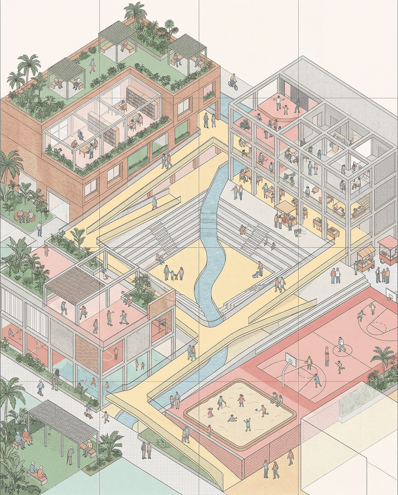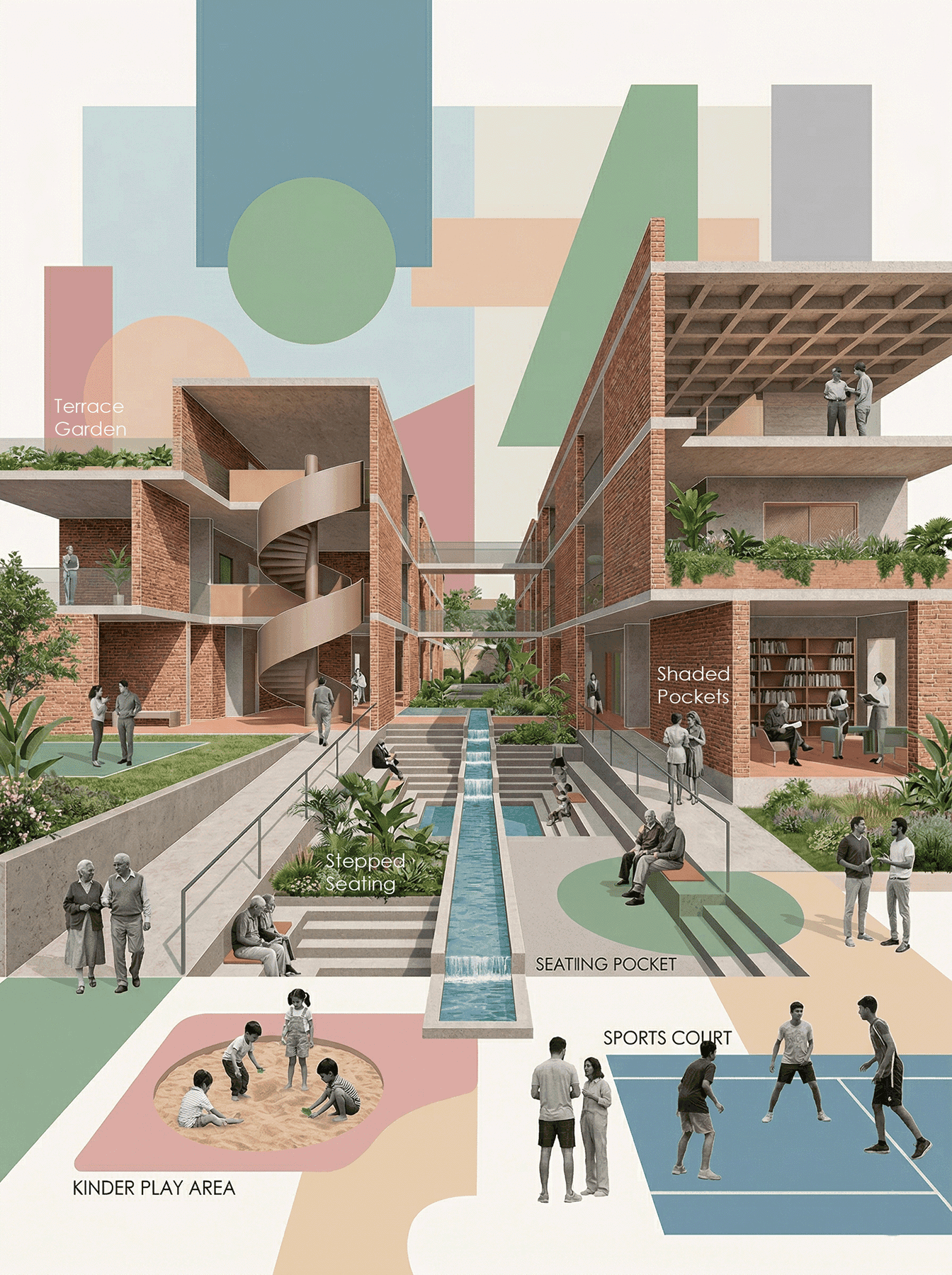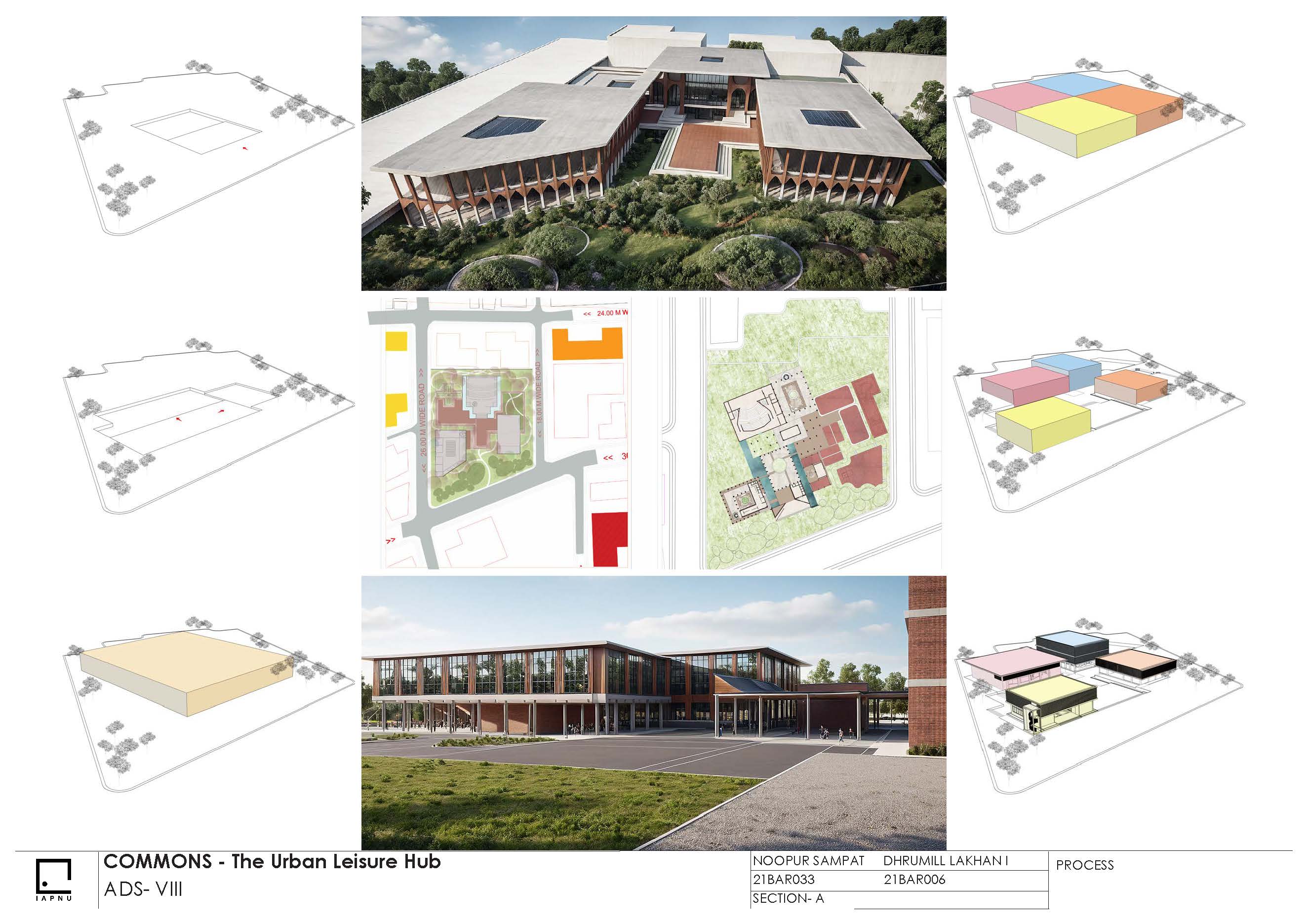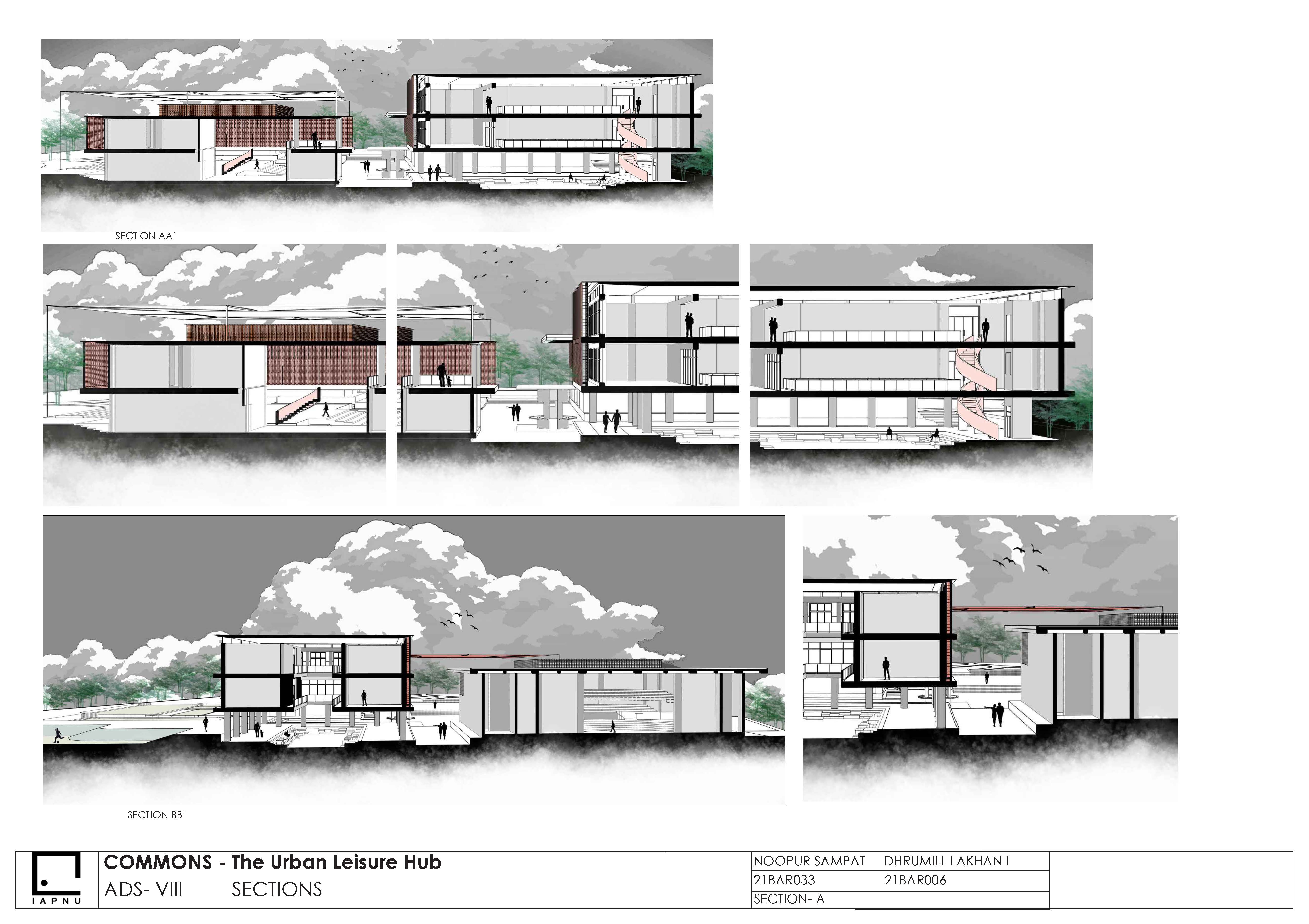 This project positions the recreational hub as an urban condenser an inclusive public realm that activates everyday life through movement, interaction, and accessibility. Drawing from the linear dynamism of Spreeufer’s promenades and the social intensity of Manek Chowk, it creates a porous, fluid environment for all age groups. The design operates as a living urban field, where circulation, pause, and program overlap to strengthen the city’s social fabric.